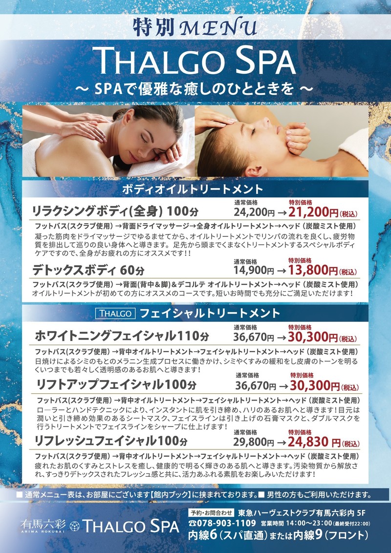| 内容 | アロママッサージ・タラソマッサージ / トリートメント(ヘッド・フット・メンズ・フェイシャル) / アロマコンピ・スパコンピ・リラックスコンビ |